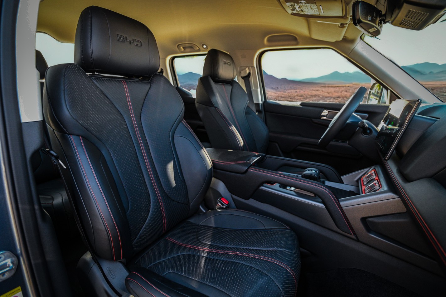 Its bold, muscular stance is highlighted by a striking front grille featuring the BYD mega symbol, LED headlights, and connected daytime running lights. Clean lines enhance both aesthetics and aerodynamics, while 18-inch alloy wheels add to its off-road-ready design.