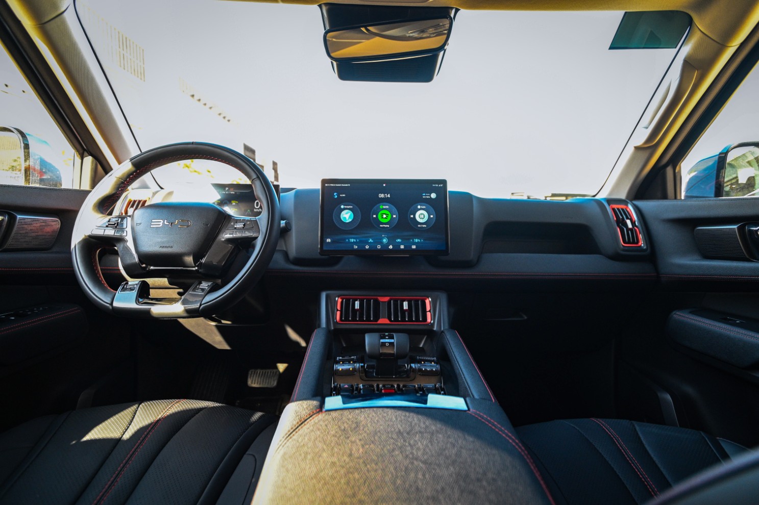 Inside, the BYD Shark 6 DMO blends premium materials with a minimalist design. Leather seats with orange accents provide a refined yet sporty feel. The Premium variant features a 6-way power-adjustable driver seat with 4-way lumbar support, as well as heated and ventilated front seats for maximum comfort.