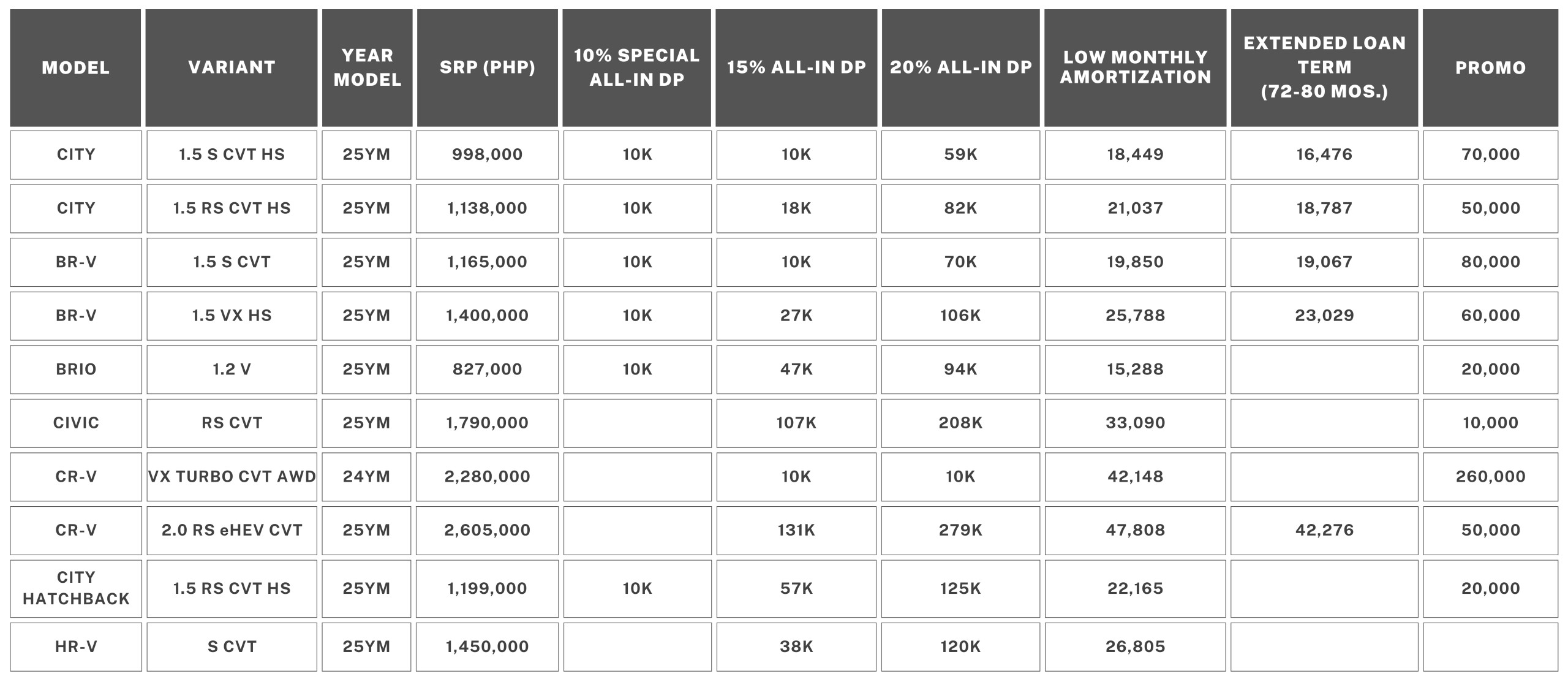 HCPI has special promos for its e:HEV vehciles, as well. These include low cash-out, low monthly amortizations, and all-in bundle promos. Customers may avail Honda’s e:HEV models with a 15% or 20% downpayment, payable in 60 months. BPI Auto Loan’s extended loan program is also applicable here.