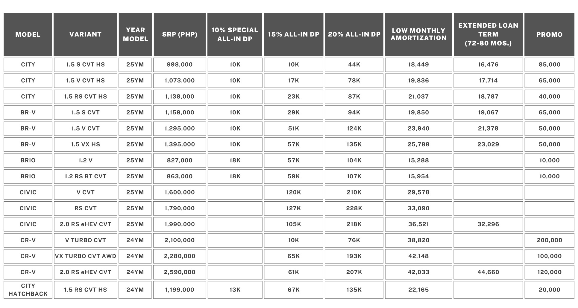 Low Cash-Out & Low Monthly Payments – Choose between 15% or 20% downpayment, payable up to 60 months. Free One-Month Amortization – Drive your Honda worry-free for the first month!* Extended Loan Terms – Pay up to 84 months with BPI Auto Loan.* Special All-In Downpayment – Get a Honda with just 10% downpayment at select banks. Free Insurance Package – Available for customers financing PHP500,000 and up.