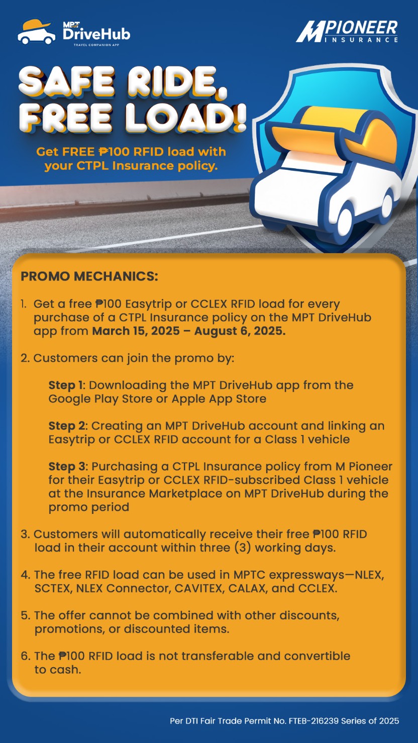 Motorists now have an even more rewarding way to stay protected on the road. MPT DriveHub, in partnership with MPioneer, is bringing back its “Safe Ride, Free Load” promo—this time with an even better offer. From March 15 to August 6, 2025, every Compulsory Third Party Liability (CTPL) insurance policy purchased through the MPT DriveHub app comes with a free ₱100 RFID load for Easytrip or CCLEX accounts.